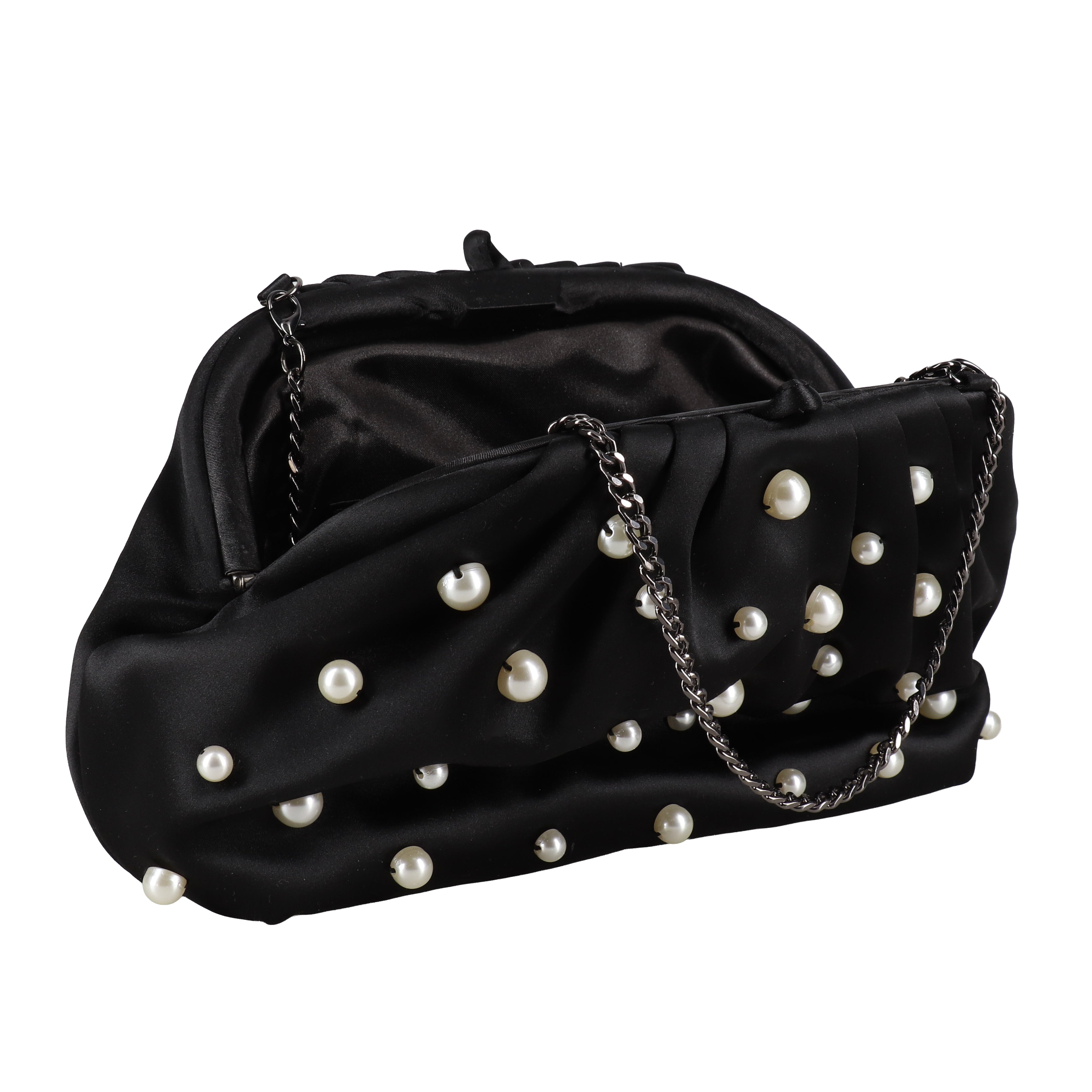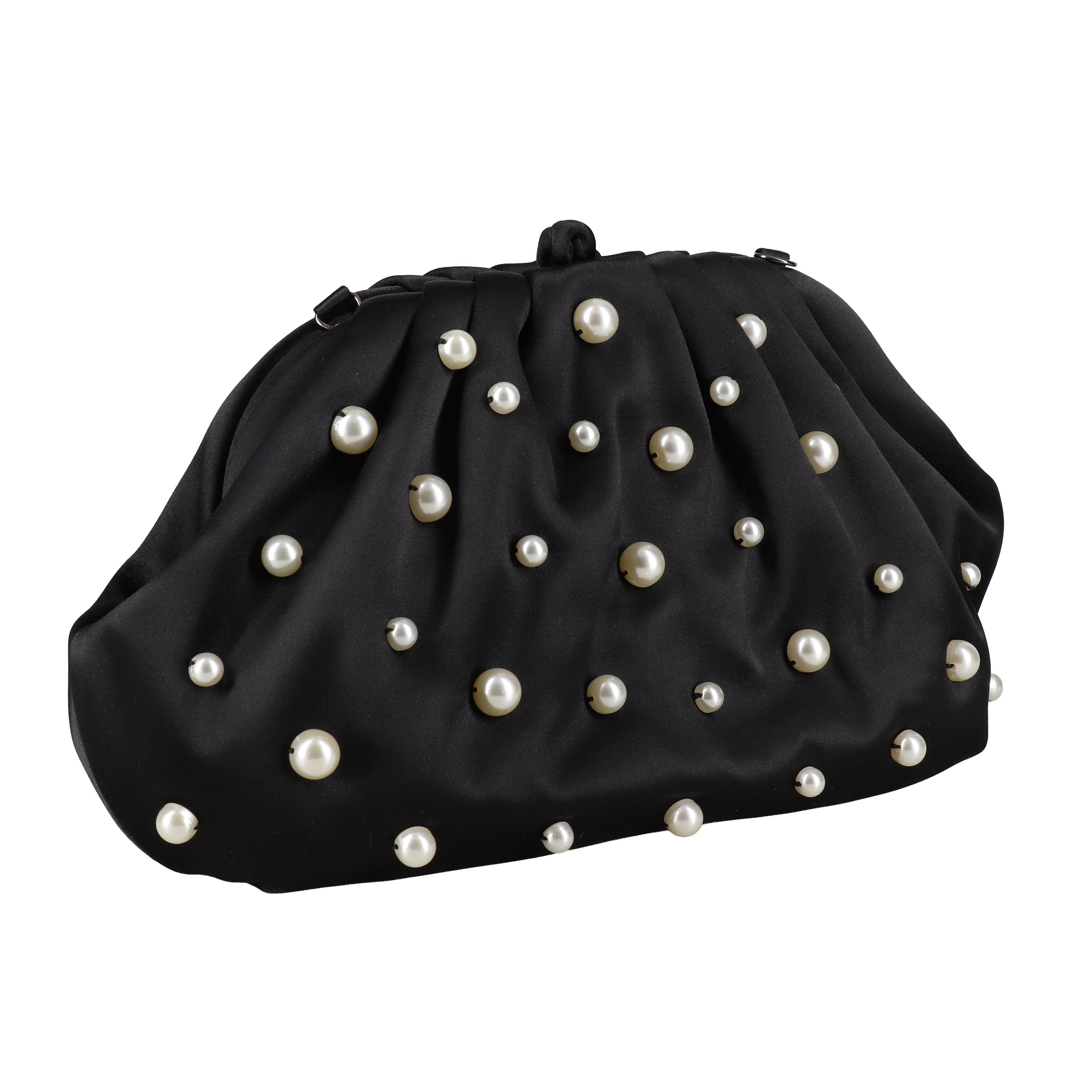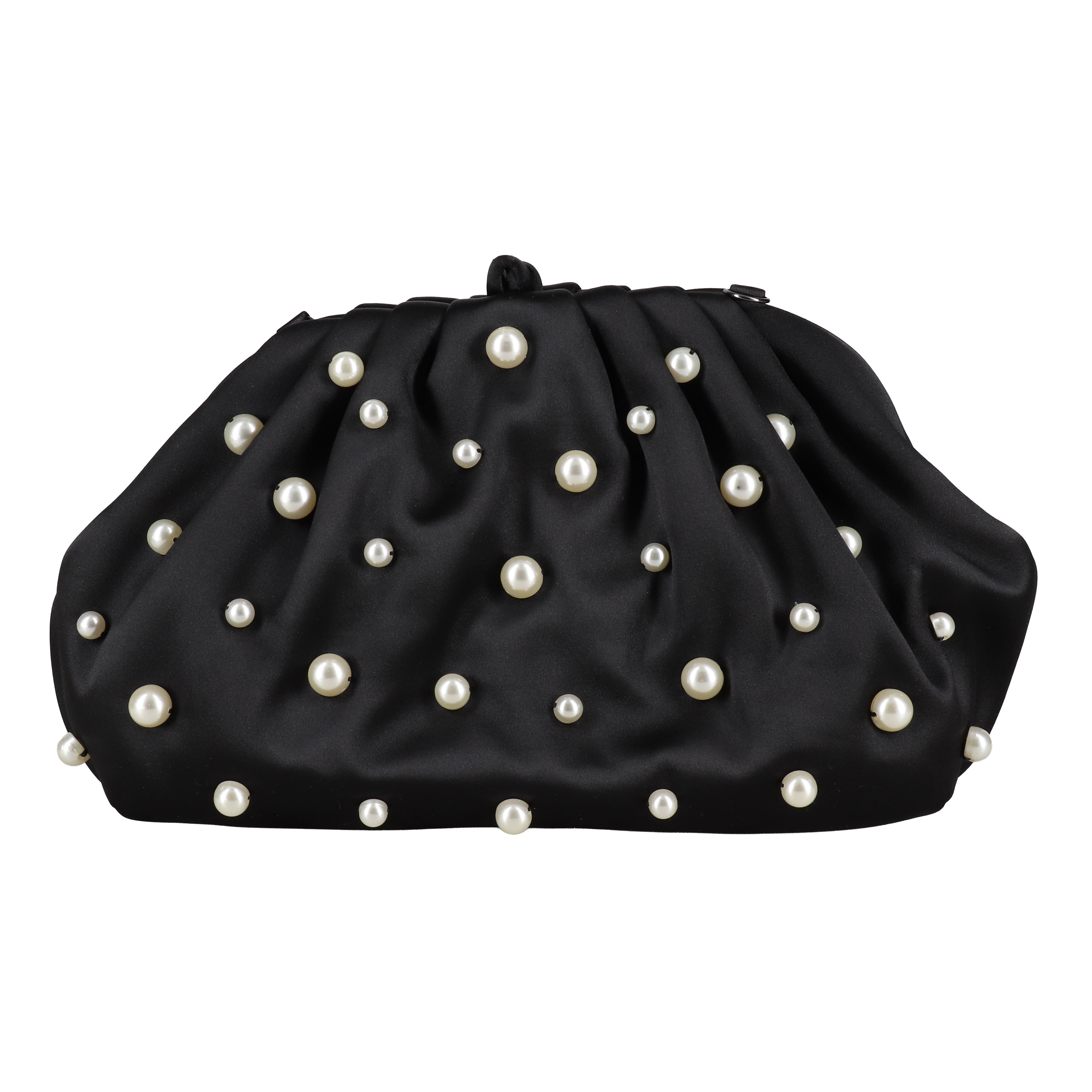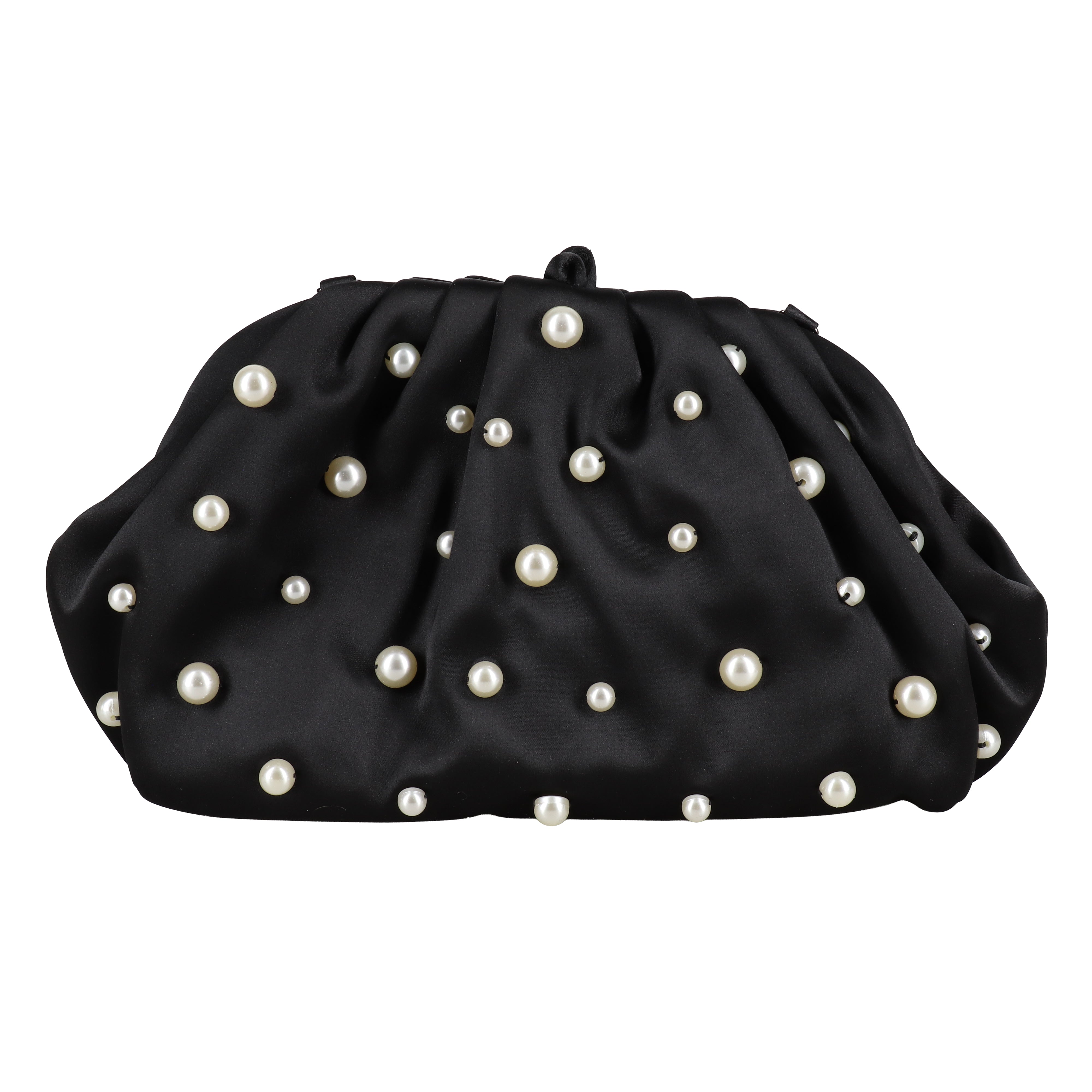 Elevate your evening look with the Jewel Badgley Mischka Margot Dotted Beads Pleated Pouch Clutch. This stylish large-size evening bag boasts a unique blend of mixed beads and a pleated satin and polyester fabric.